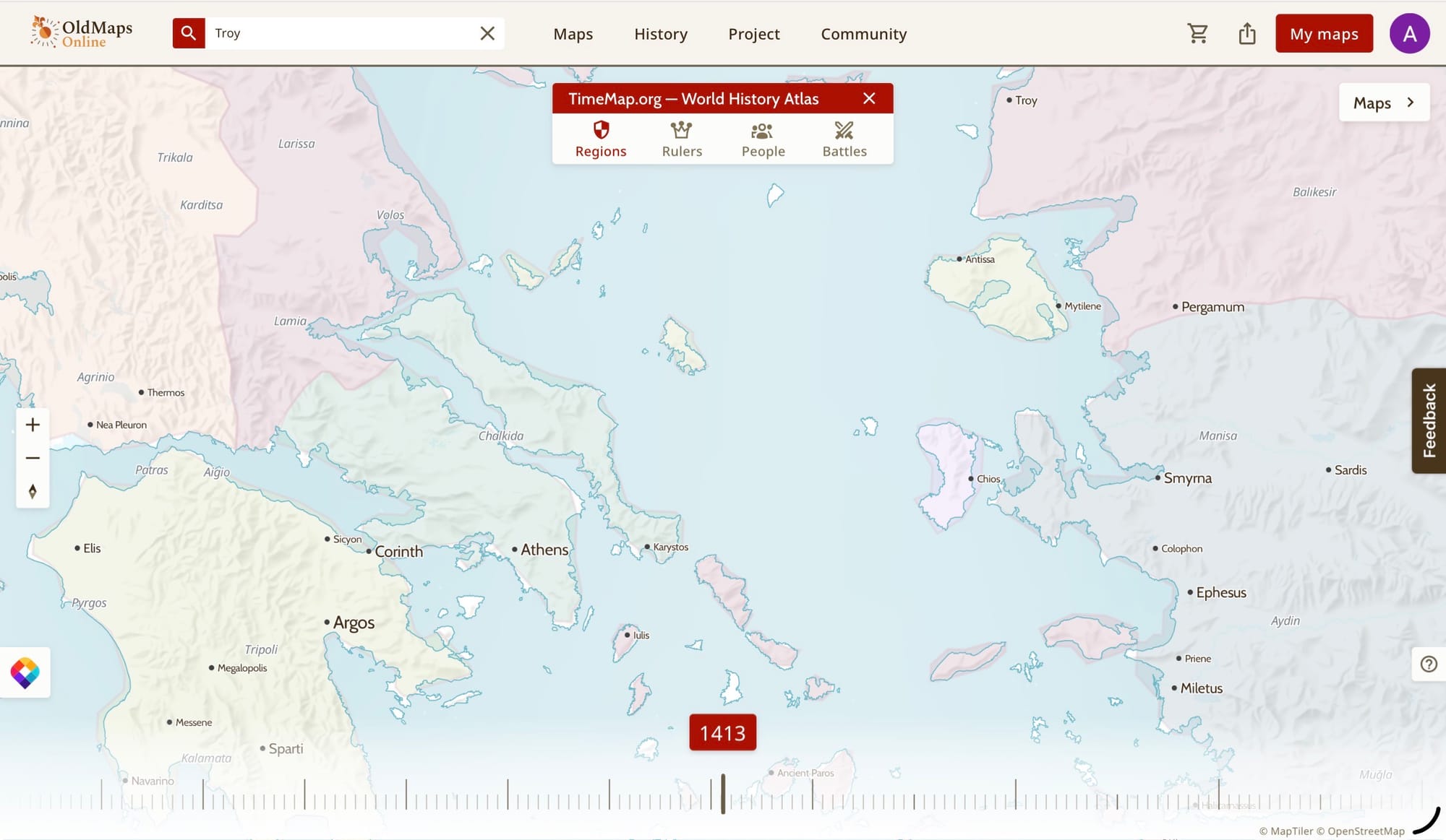 Open TimeMap, zoom to a location, and click on a city to begin exploring its historical context.